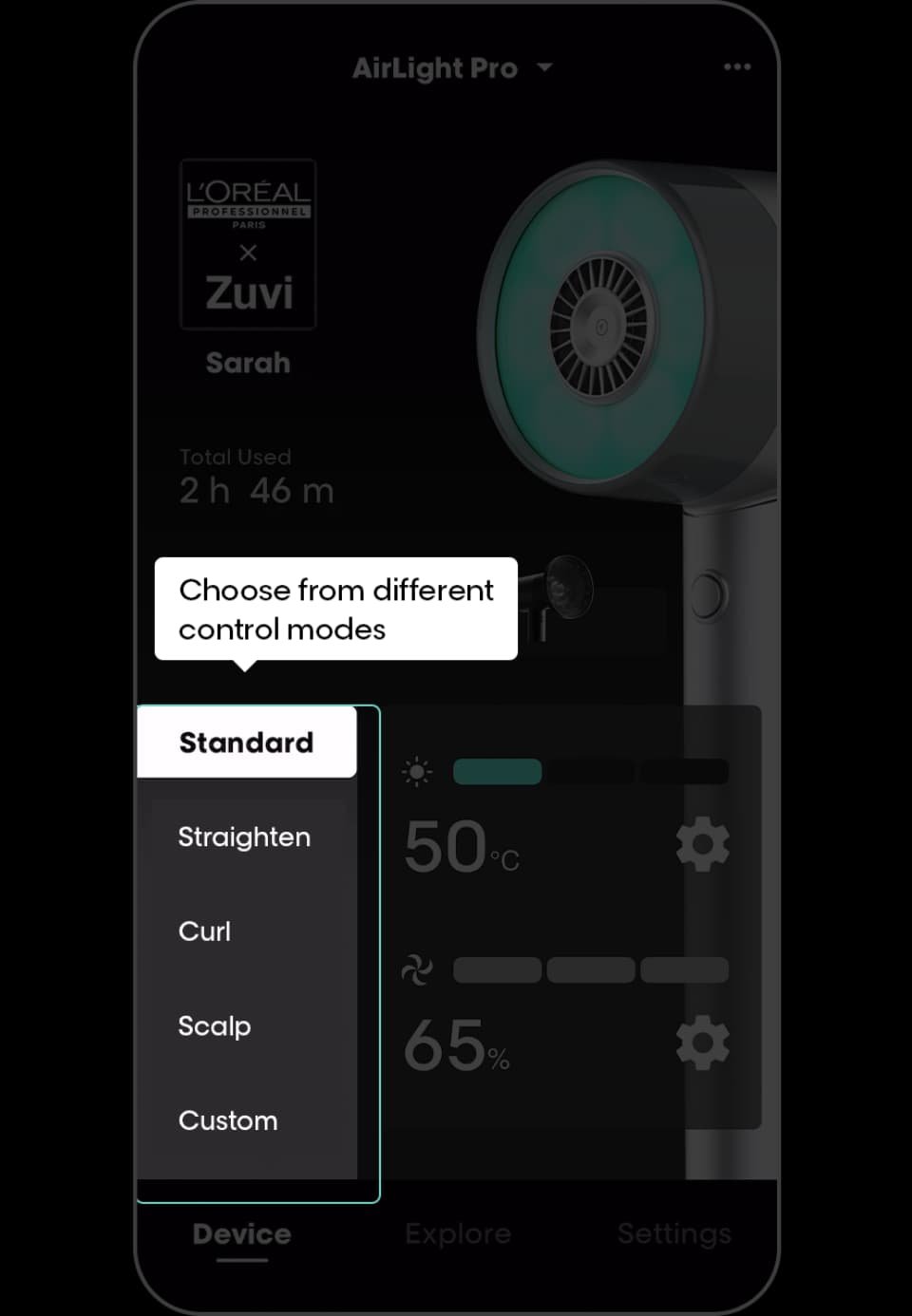 - Limpe os filtros regularmente ou assim que receber uma notificação no ecrã. O AirLight Pro está equipado com 2 filtros, um na parte traseira e outro na parte inferior do cabo. A frequência de limpeza pode variar consoante o ambiente (qualidade do ar/pó/partículas como laca). O dispositivo exibe notificações inteligentes quando precisa de limpeza. Para preservar a integridade do motor e dos componentes internos, o dispositivo reduzirá automaticamente a sua potência e acabará por parar se os filtros ficarem obstruídos.